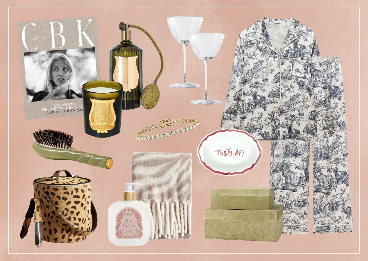 Dish | Pajama top & bottoms, similar here | CBK book | Candle & Perfume | Brush | Storage boxes | Bracelet | Leopard ice bucket | Coupe glasses | Lotion | Blanket
