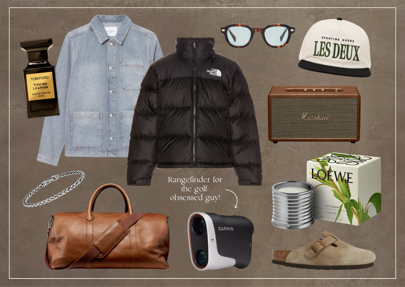 Glasses | Denim shirt | North Face puffer | Marshall speaker | Hat | Rangefinder | Tom Ford cologne | DY bracelet | Duffle bag | Loewe candle | Birkenstocks