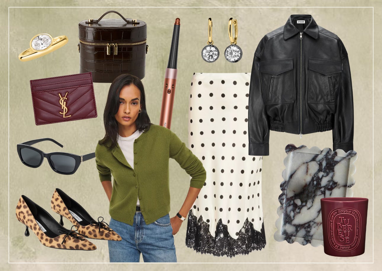 YSL cardholder | Ring | Cosmetic case | Sunglasses | Leopard heels | Dyson Airwrap | Cardigan | Earrings | Slip skirt | Leather jacket, similar here | Marble tray | Candle
