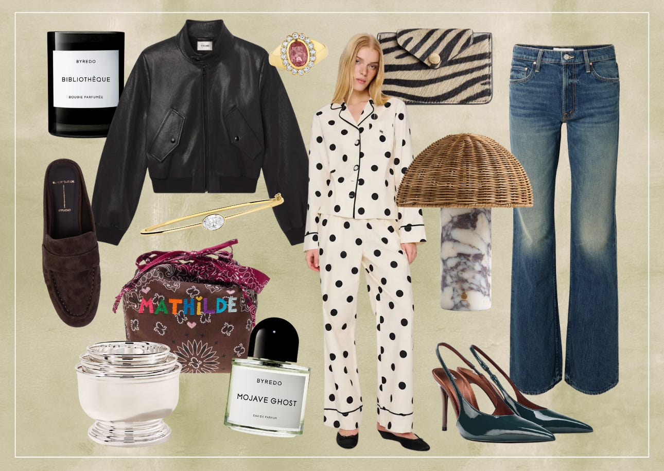 Byredo candle | Leather jacket | Ring | Loafers | Bracelet | Toiletry bag | Silver bowls | Byredo perfume | Pajamas | Zebra card holder | Lamp | Heels | Jeans