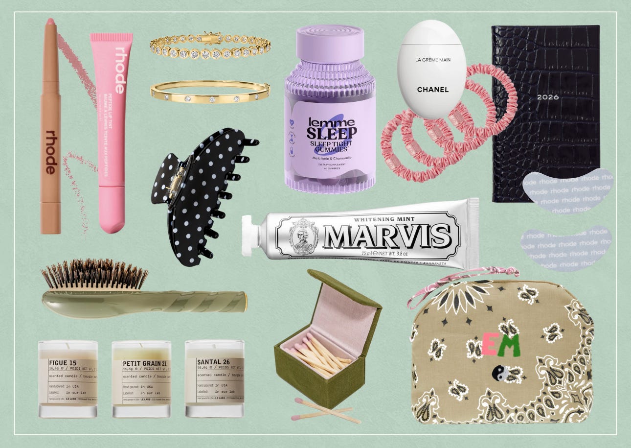 Scrunchies | Planner | Rhode lip set | Bracelets here & here | Lemme Sleep | Chanel hand lotion | Claw clip | Brush | Toothpaste | Candle set | Mini matchbox | Rhode eye patches | Toiletry bag